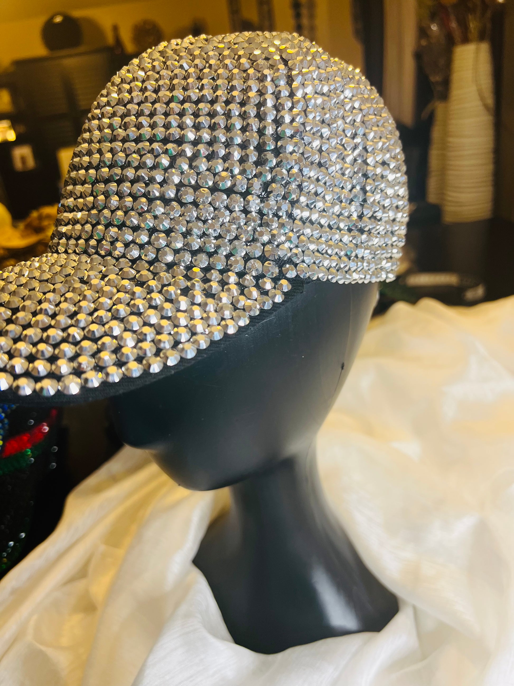 Each cap is fully covered with bling rhinestones. These caps have a velcro closing with an adjustable band in the back. It comes on different colors red, green, silver, white, royal blue, black and black, red, green.
